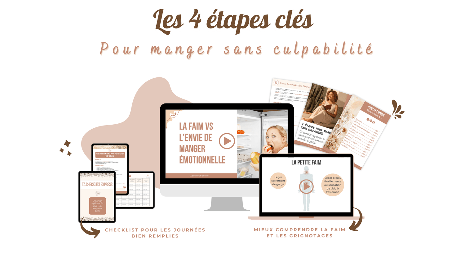 Et c'est exactement pour ça que j'ai créé les 4 étapes clés pour manger sans culpabilité, pour sortir de cette lutte intérieure et retrouver une relation plus apaisée à la nourriture, sans vous restreindre et sans prise de poids.